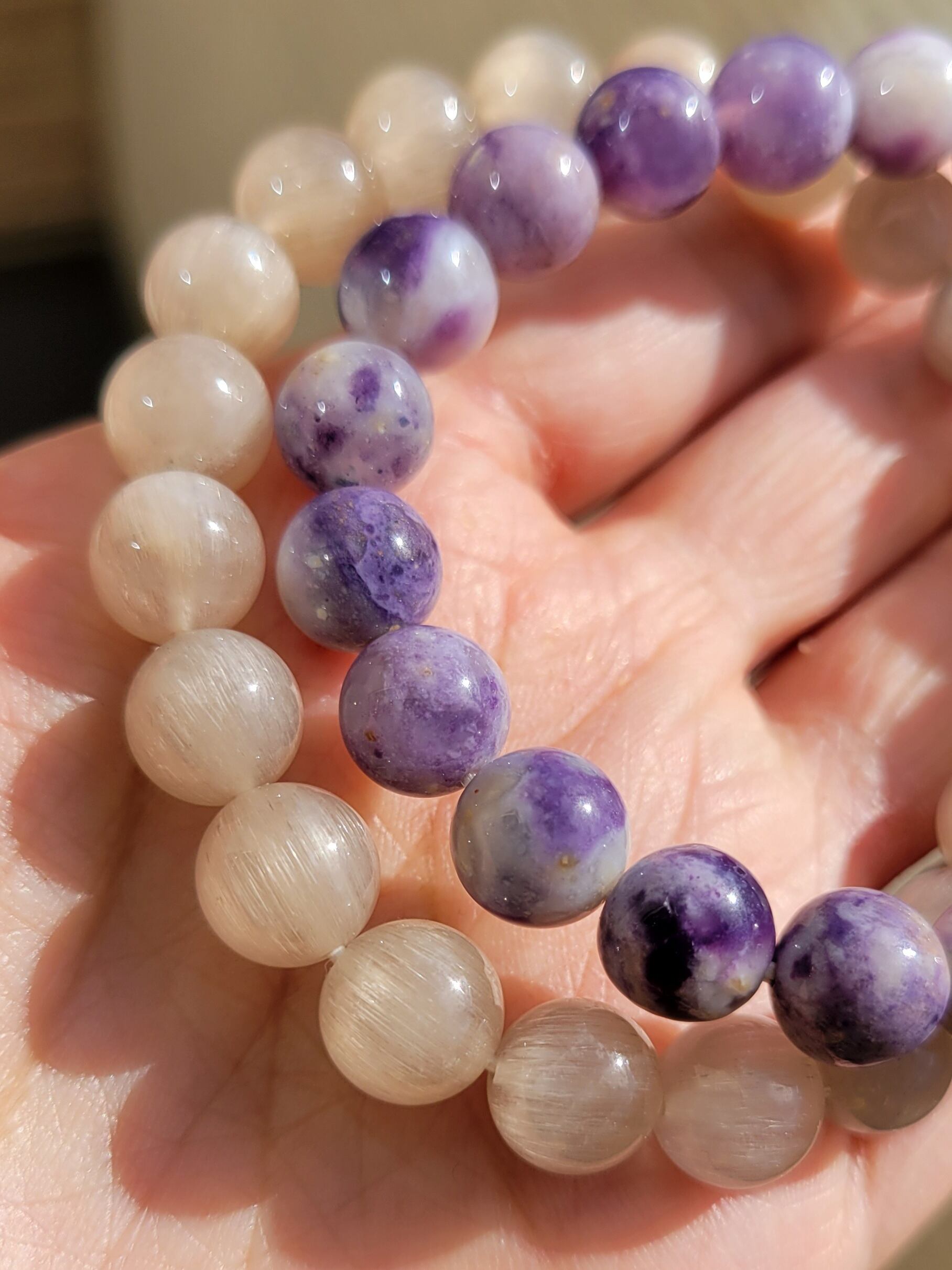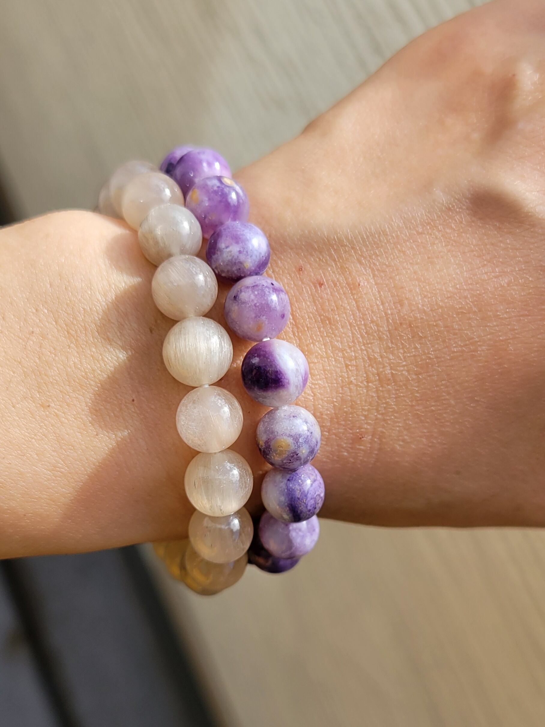紫色のマーブル模様をしており、これは混合する鉱物の割合によって十人十色の模様で、紫色がほとんどのものや、ブルーベリーヨーグルトの様な模様だったりその個性的な模様が特徴であり魅力です。