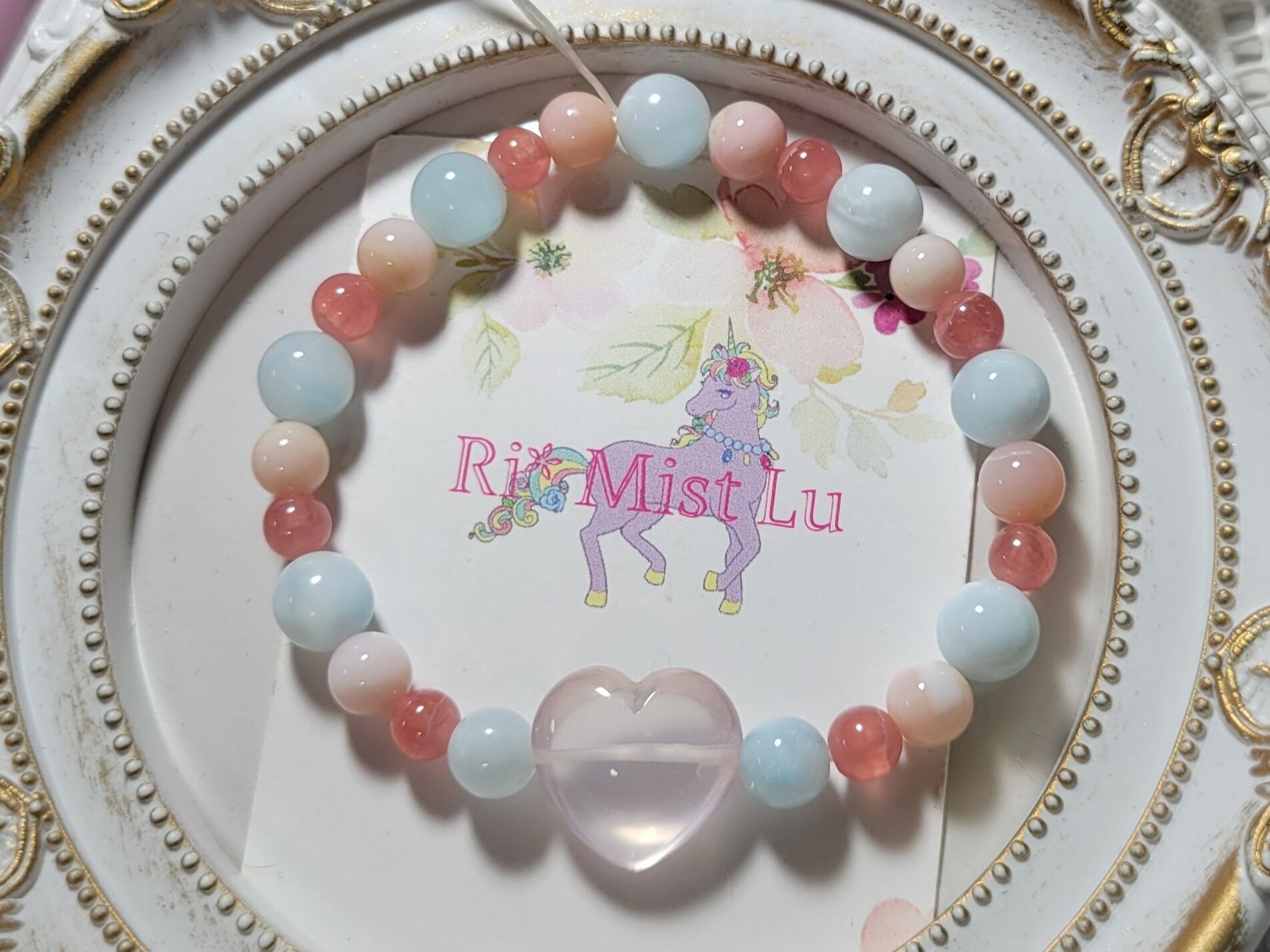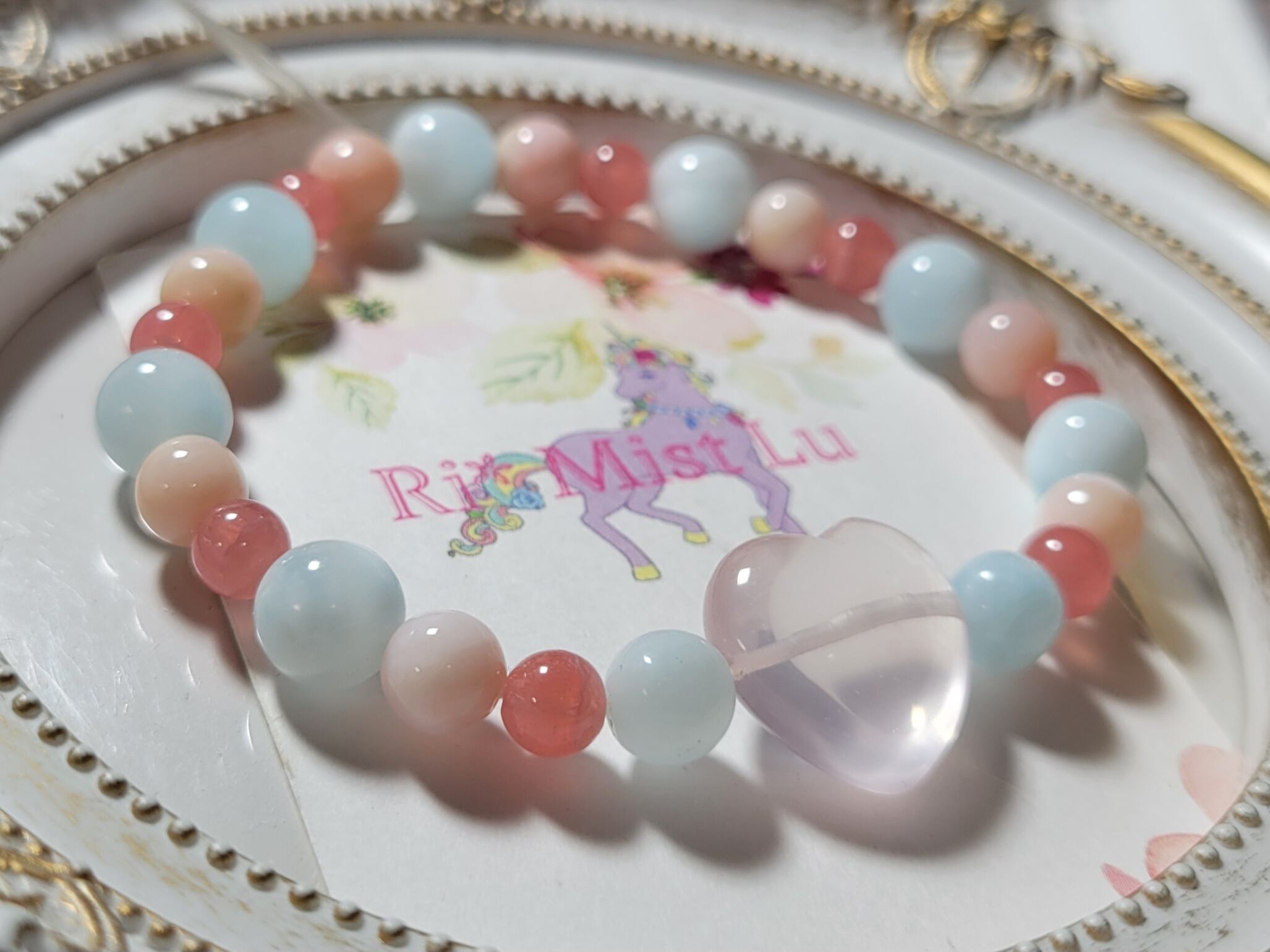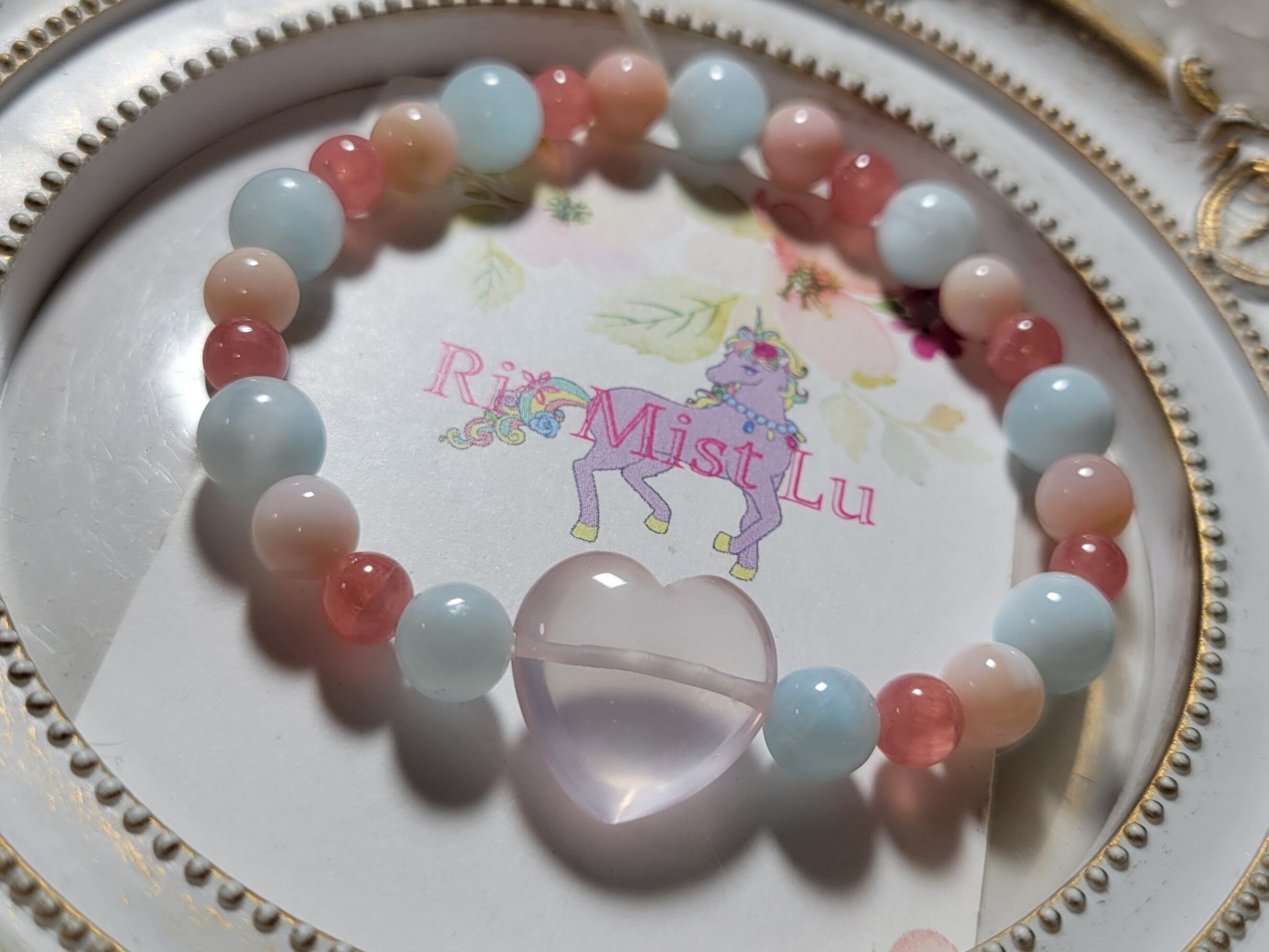 ぷるぷるハートローズとアイスラリマー、インカローズ、ピンクオパールブレスレット
