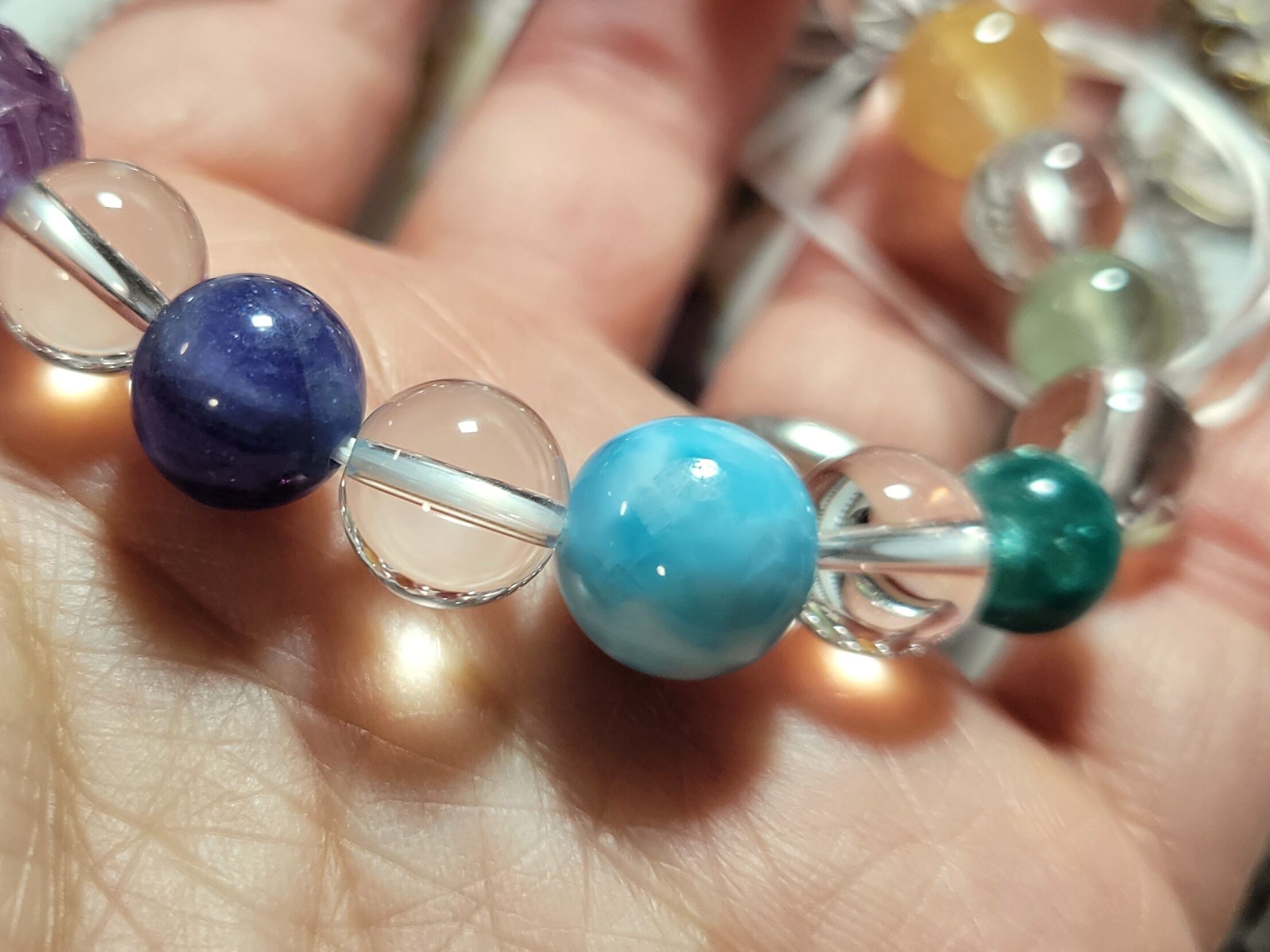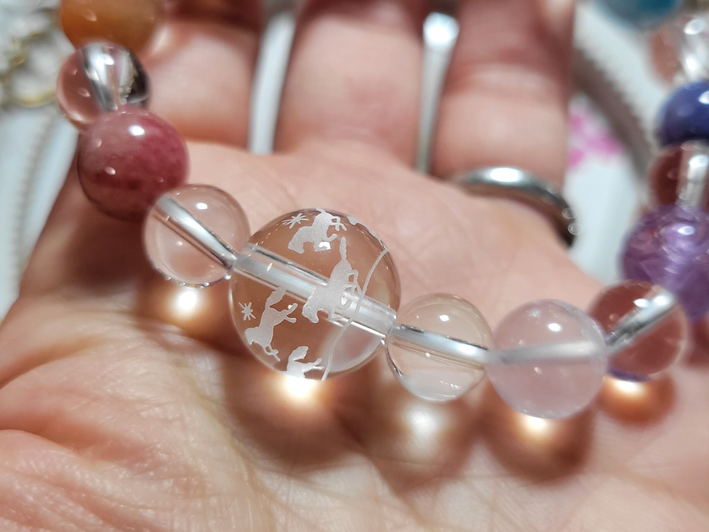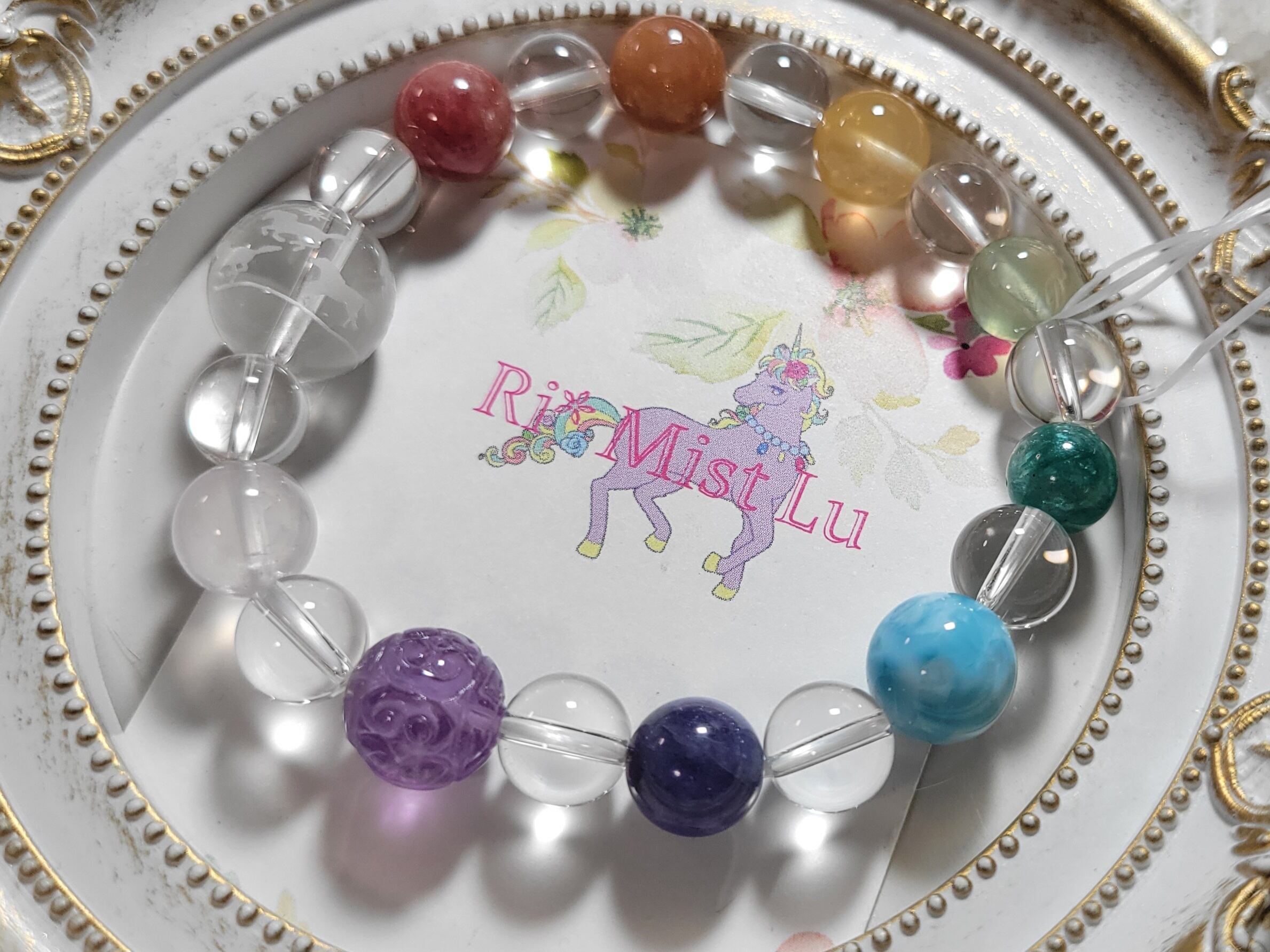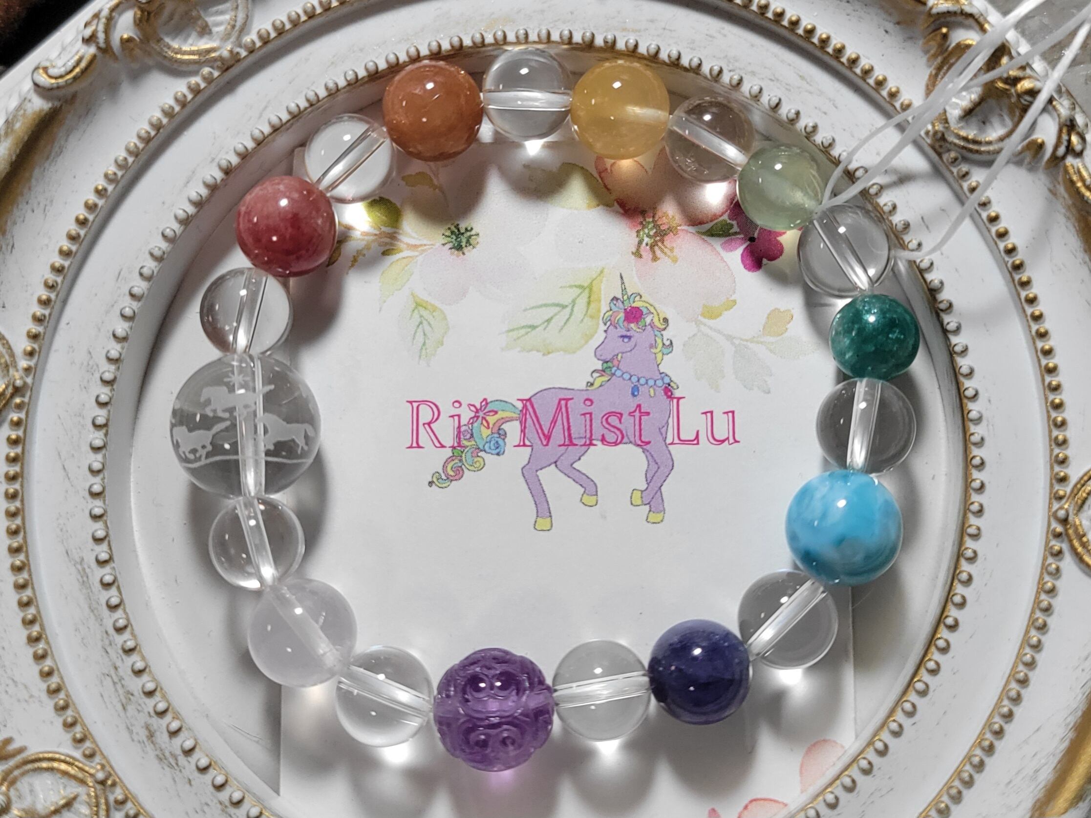 メリーゴーランドのような9頭のかわいいお馬さんたちのうまくいく水晶14ミリを囲む、カラフルなチャクラカラーに並べた色んな石たちでブレスレットを作りました!!