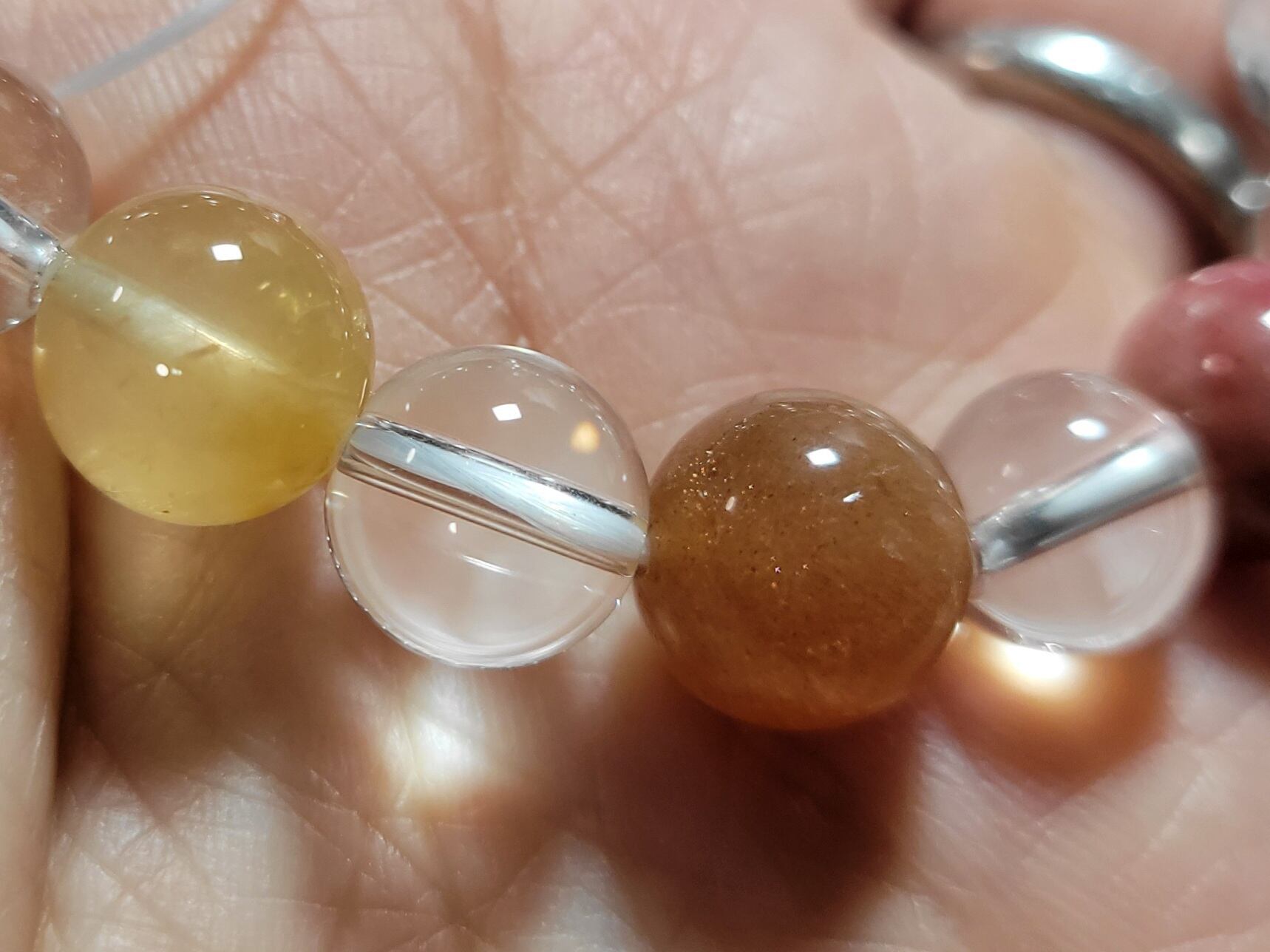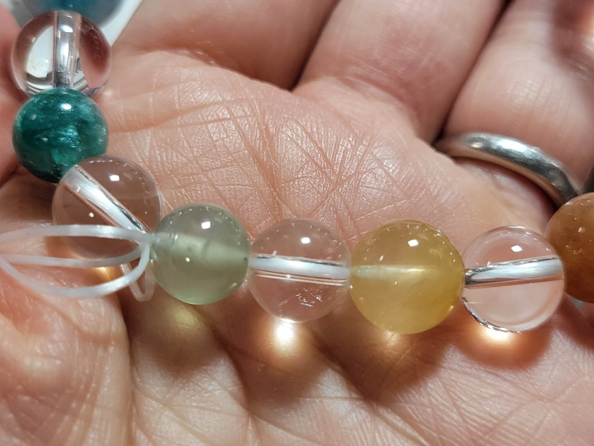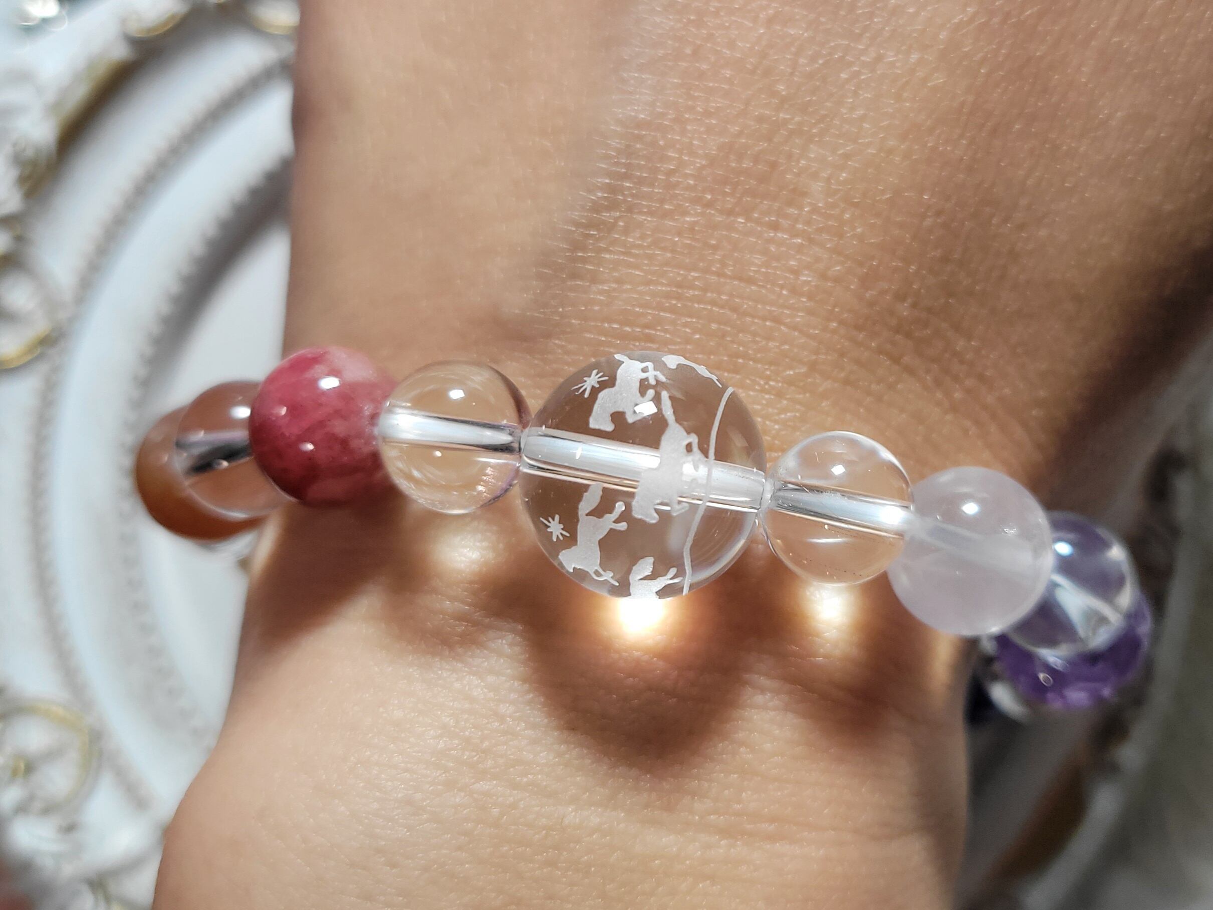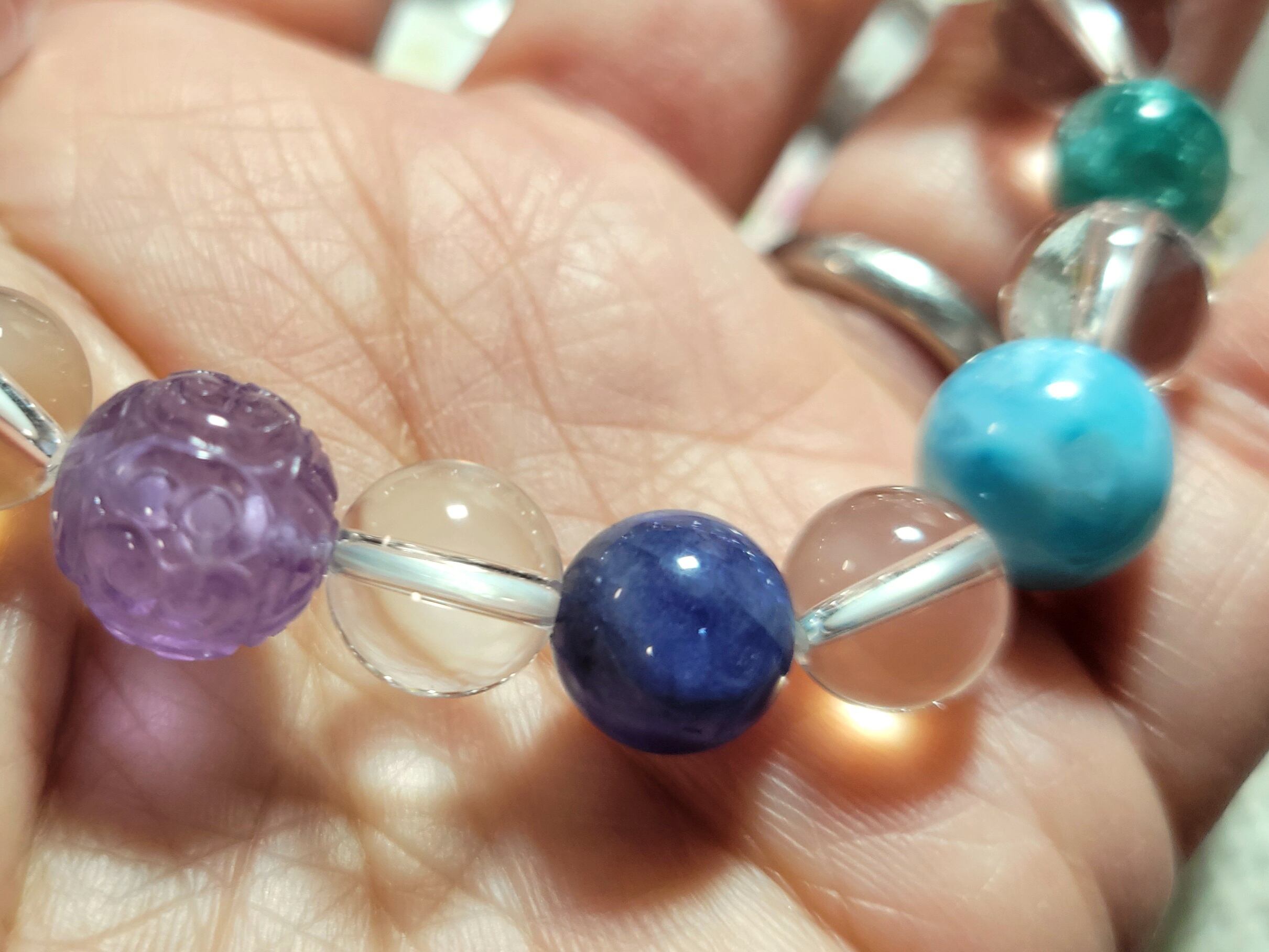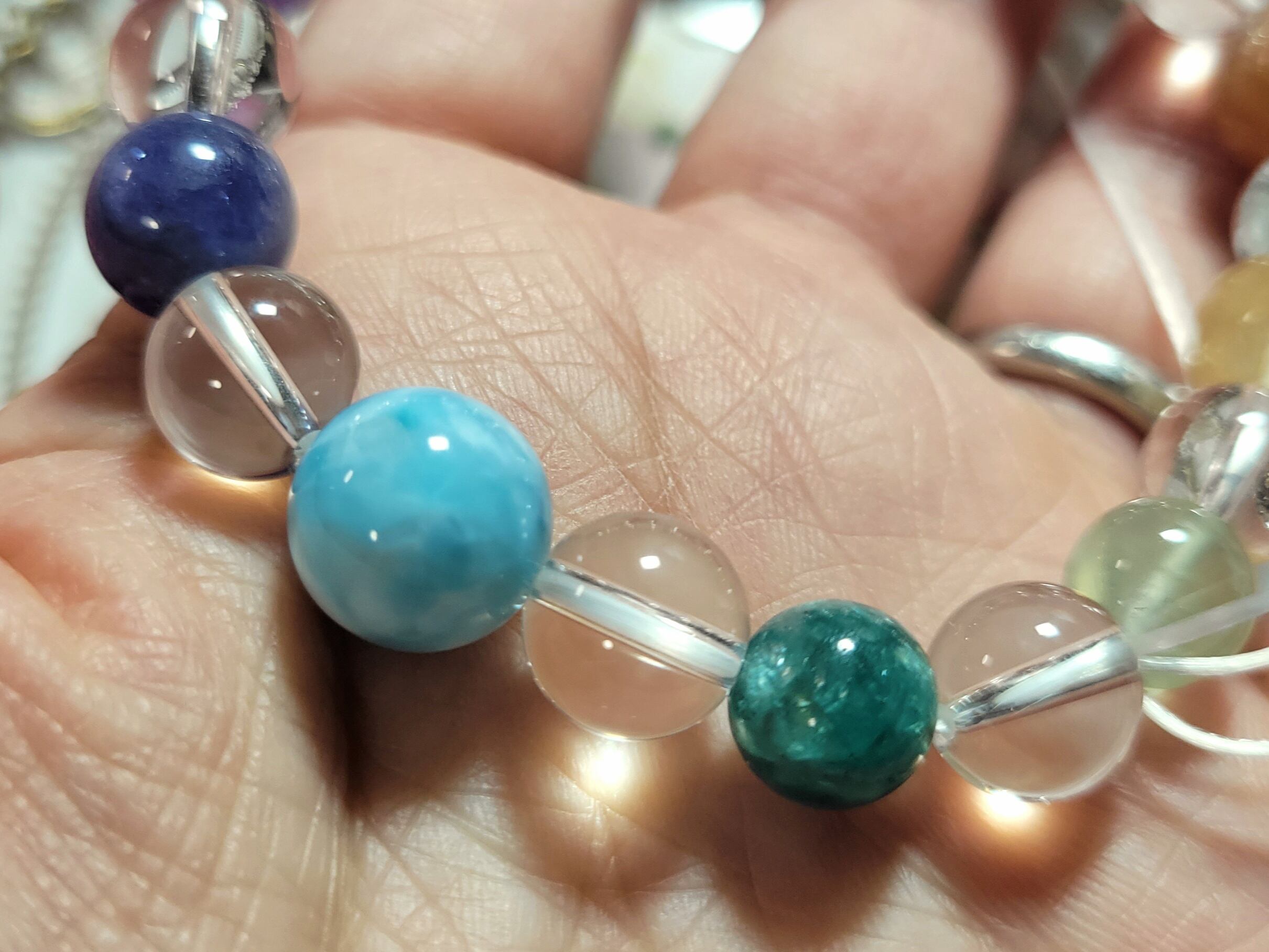 メリーゴーランドのような9頭のかわいいお馬さんたちのうまくいく水晶14ミリを囲む、カラフルなチャクラカラーに並べた色んな石たちでブレスレットを作りました!!