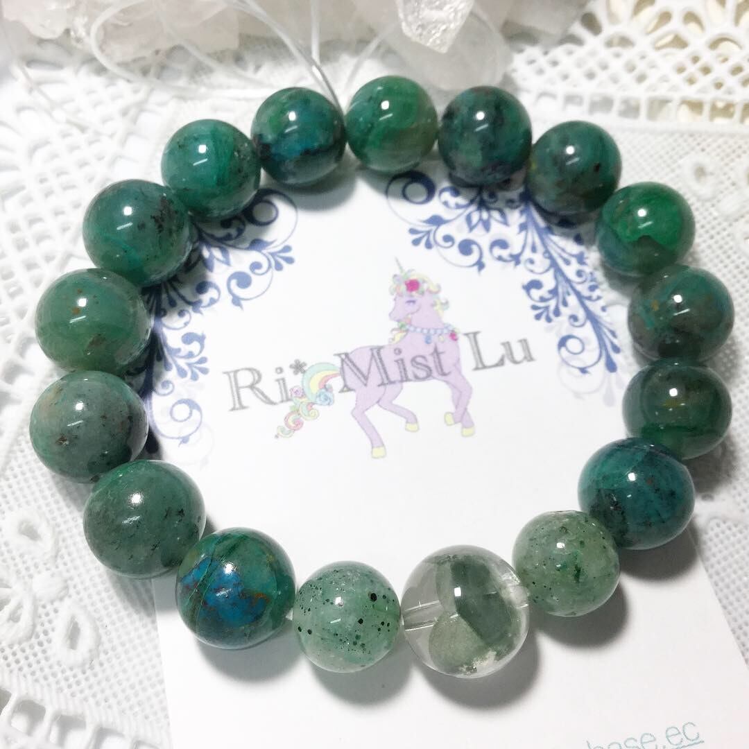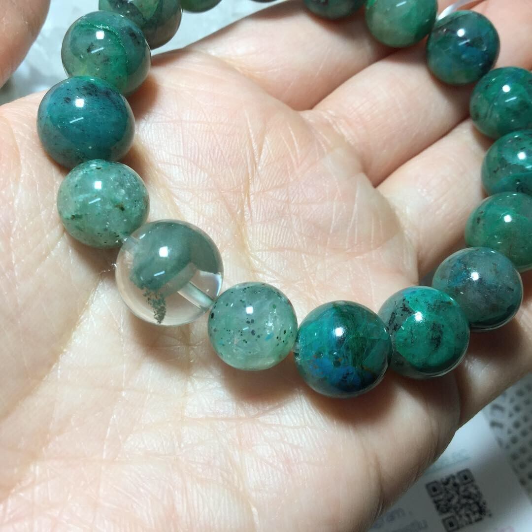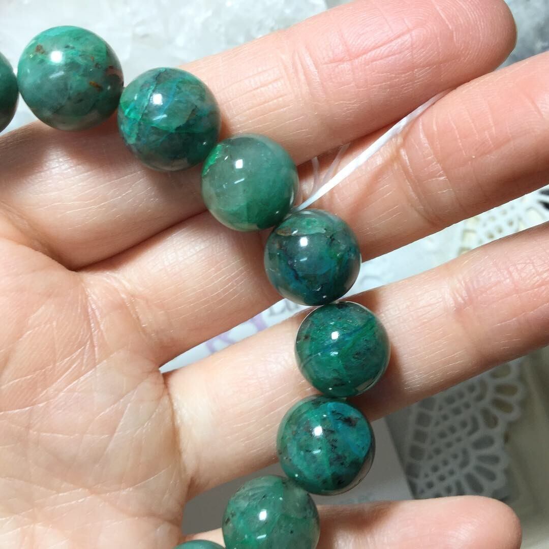 クリソコラやマラカイト、キュープライトなどいろんな鉱物が混ざる石