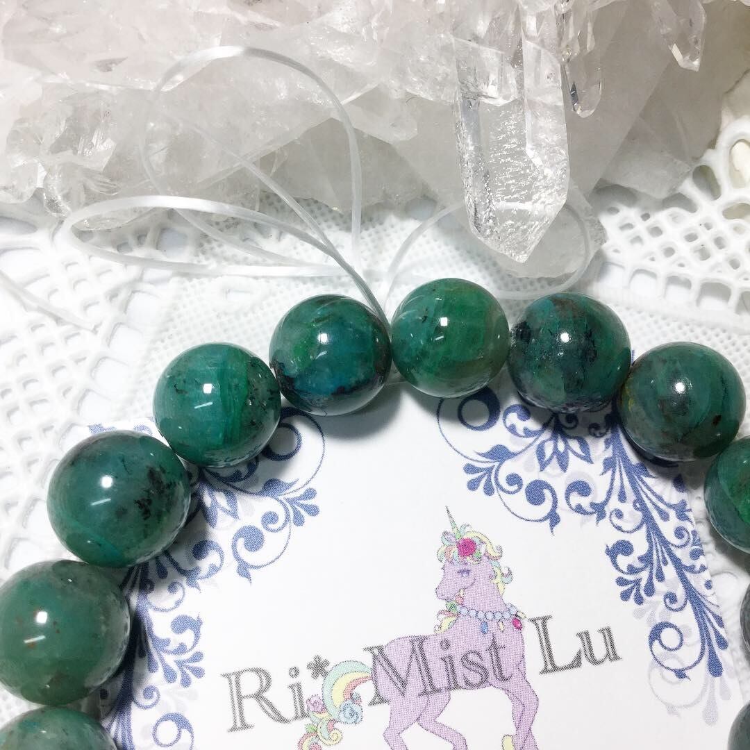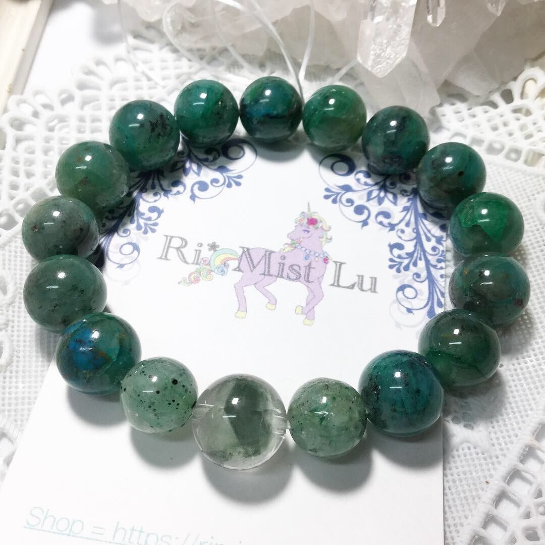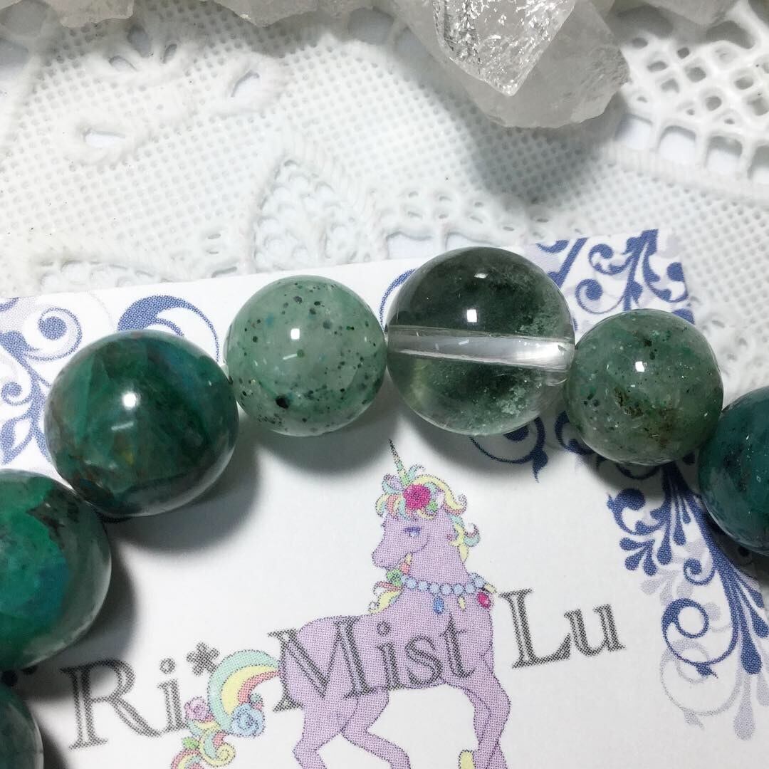 クリソコラやマラカイト、キュープライトなどいろんな鉱物が混ざる石