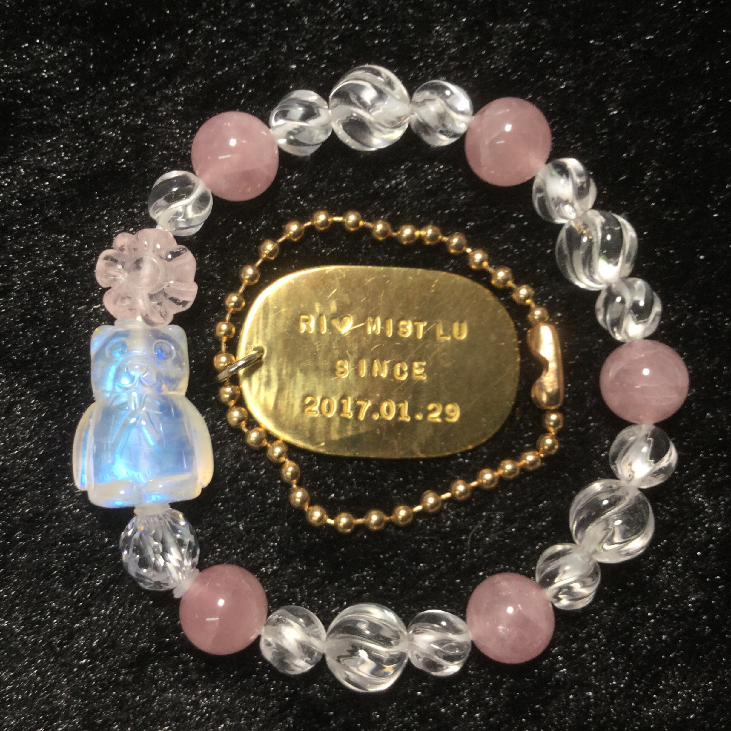 【A】リミ白クマちゃんブレス ホワイトラブラドライト、ローズクォーツ、キュービックジルコニア