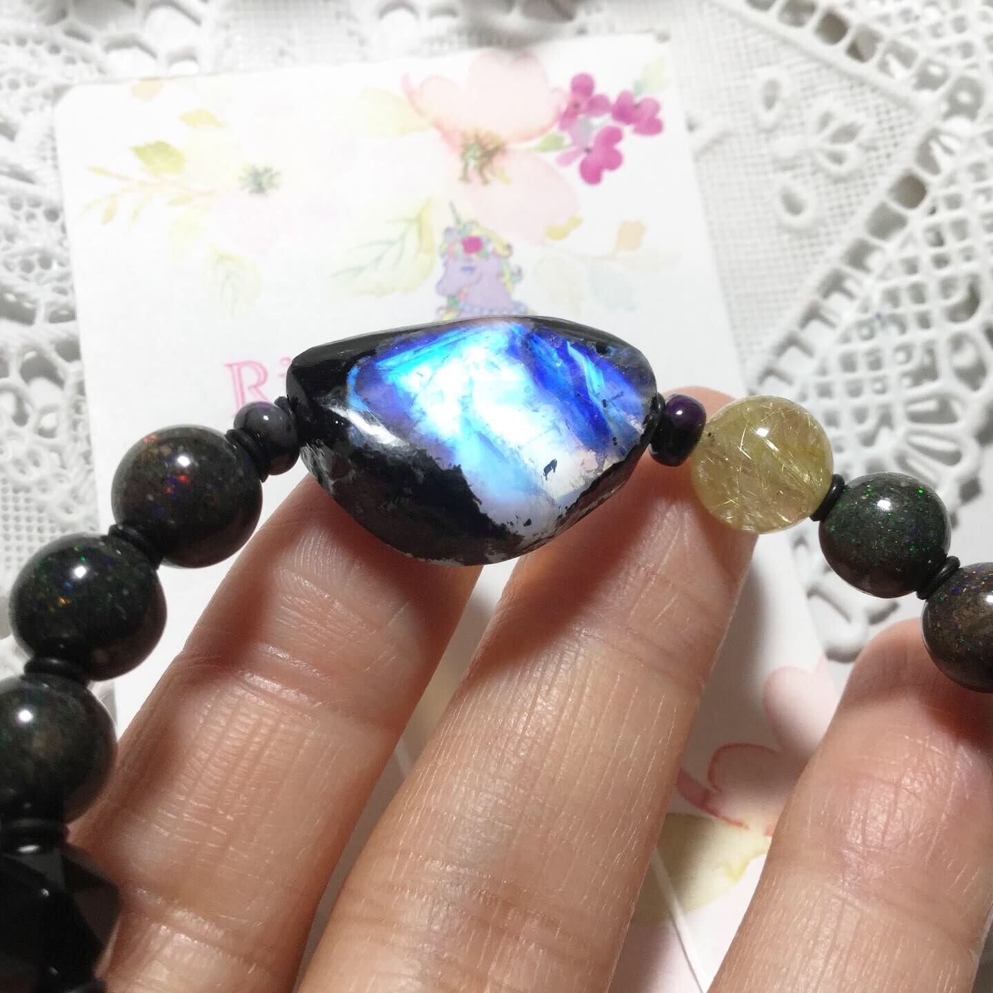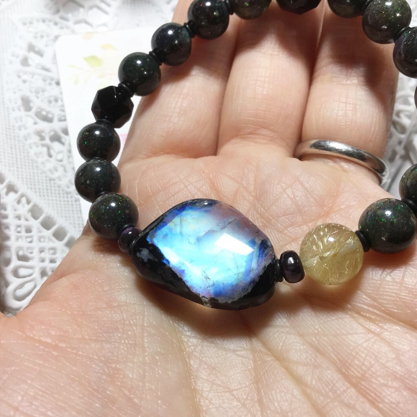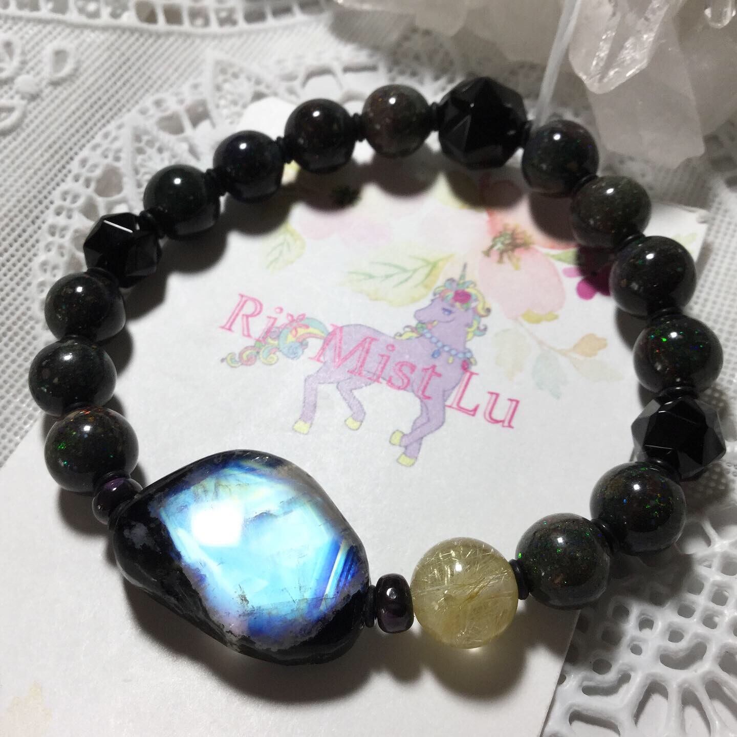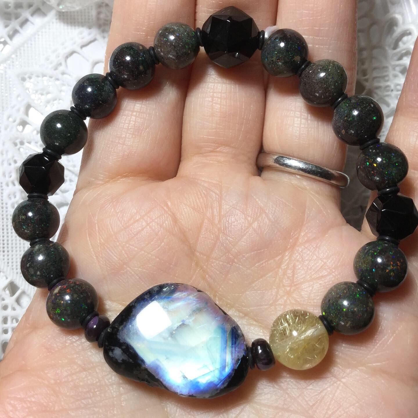 美しいホワイトラブラドライトタンブルとブラックマトリクスオパール、ルチルクォーツブレス