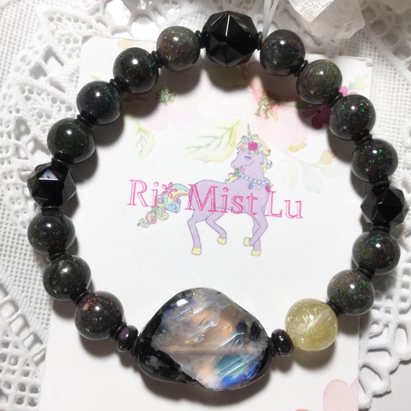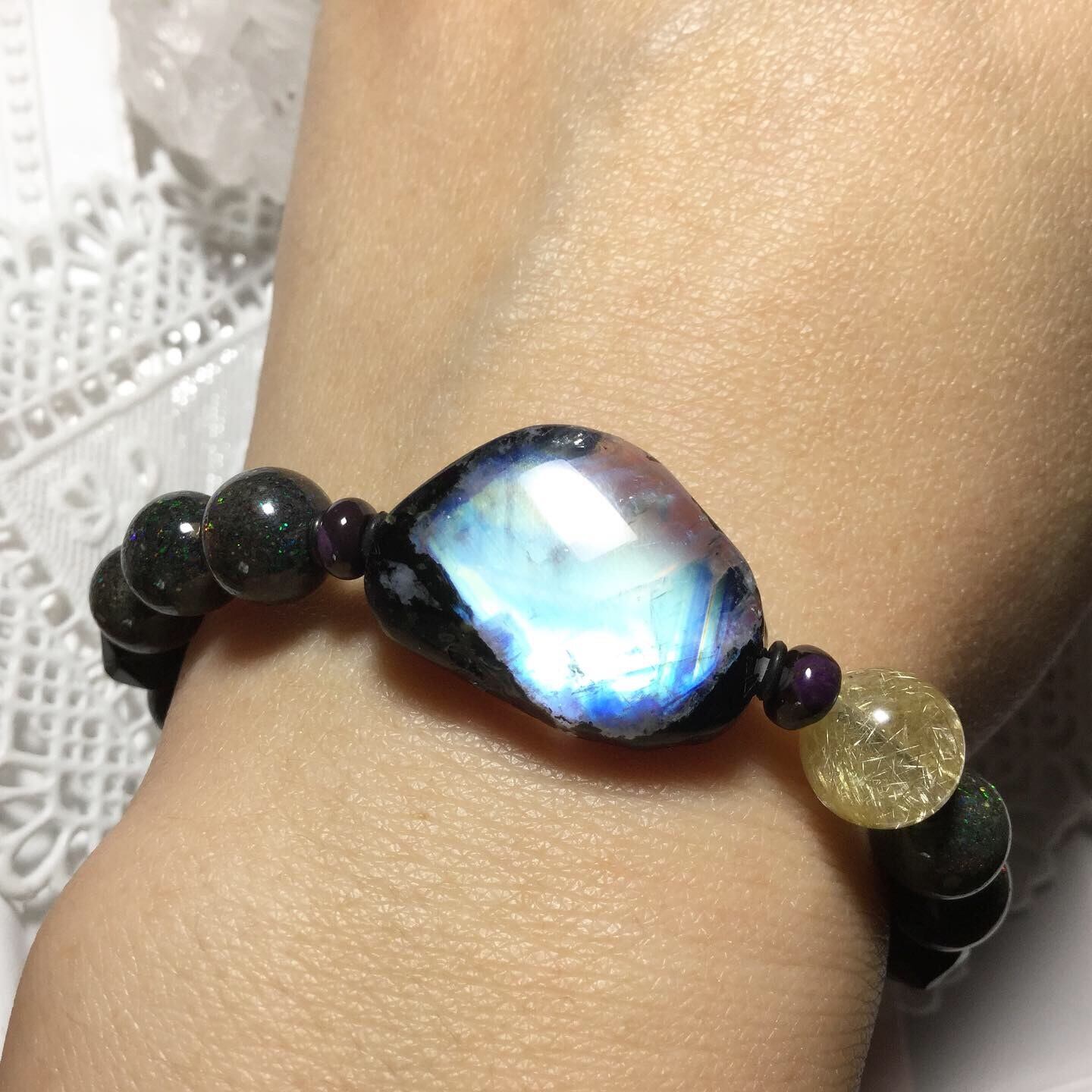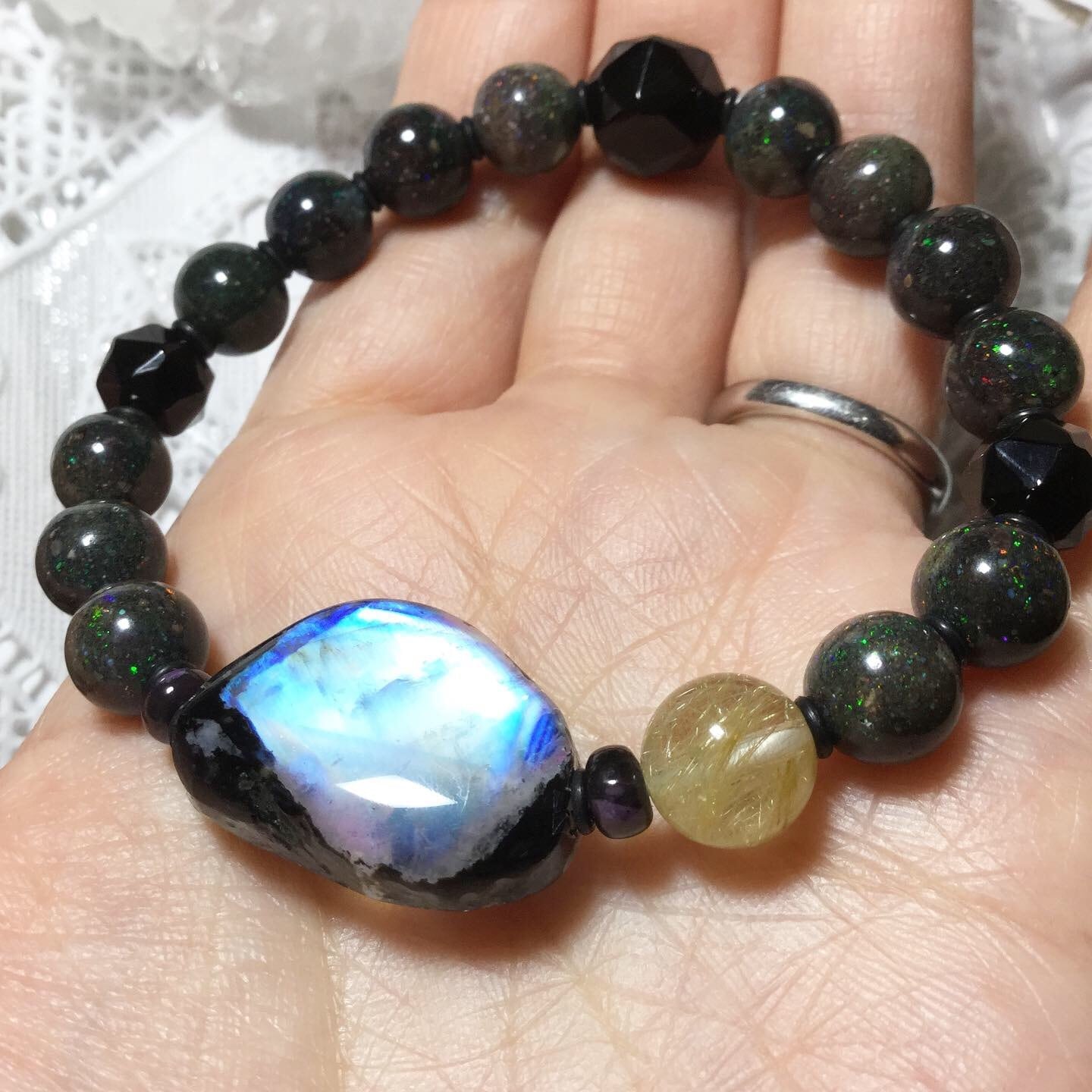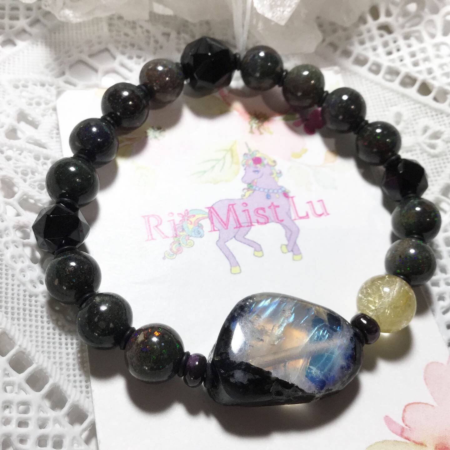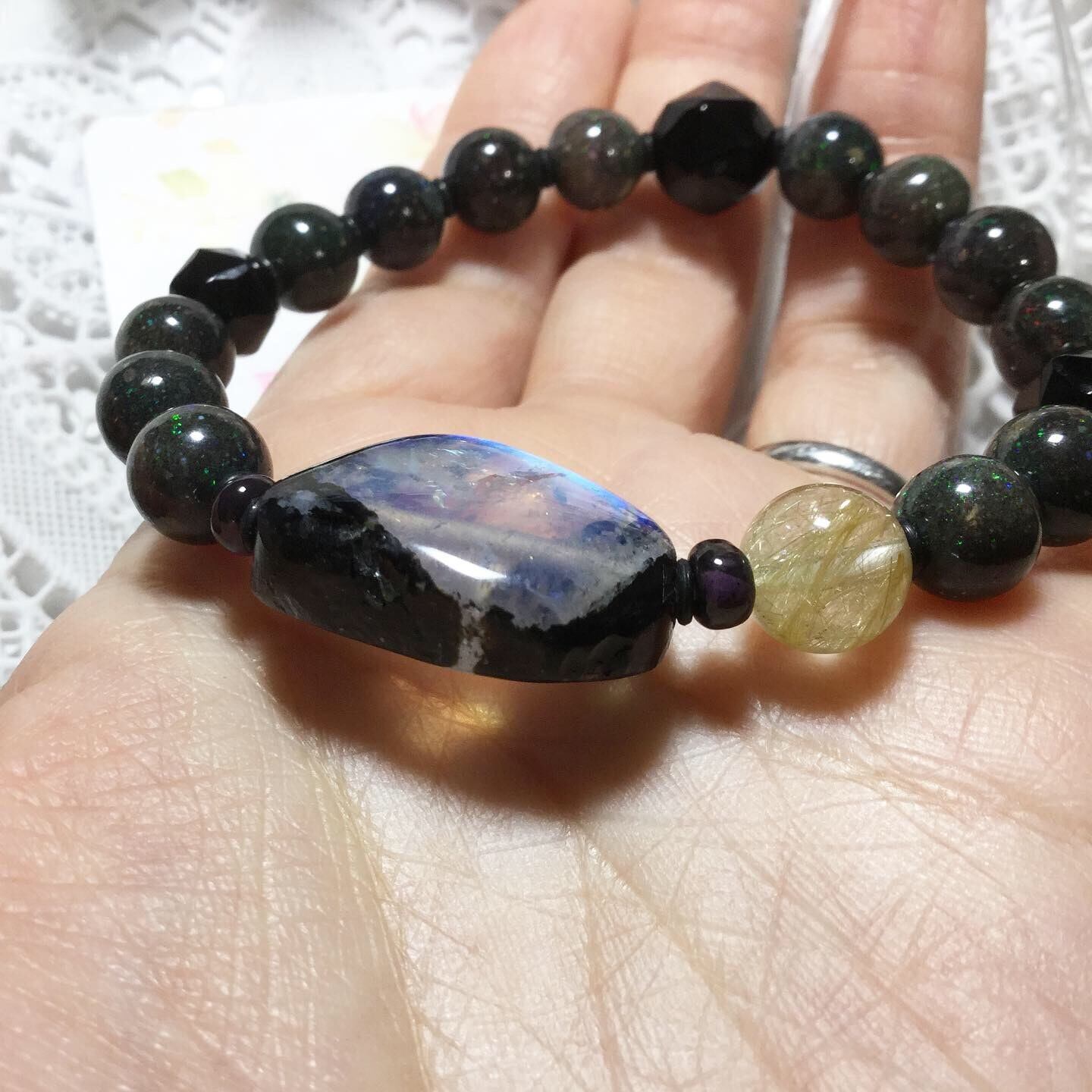 美しいホワイトラブラドライトタンブルとブラックマトリクスオパール、ルチルクォーツブレス
